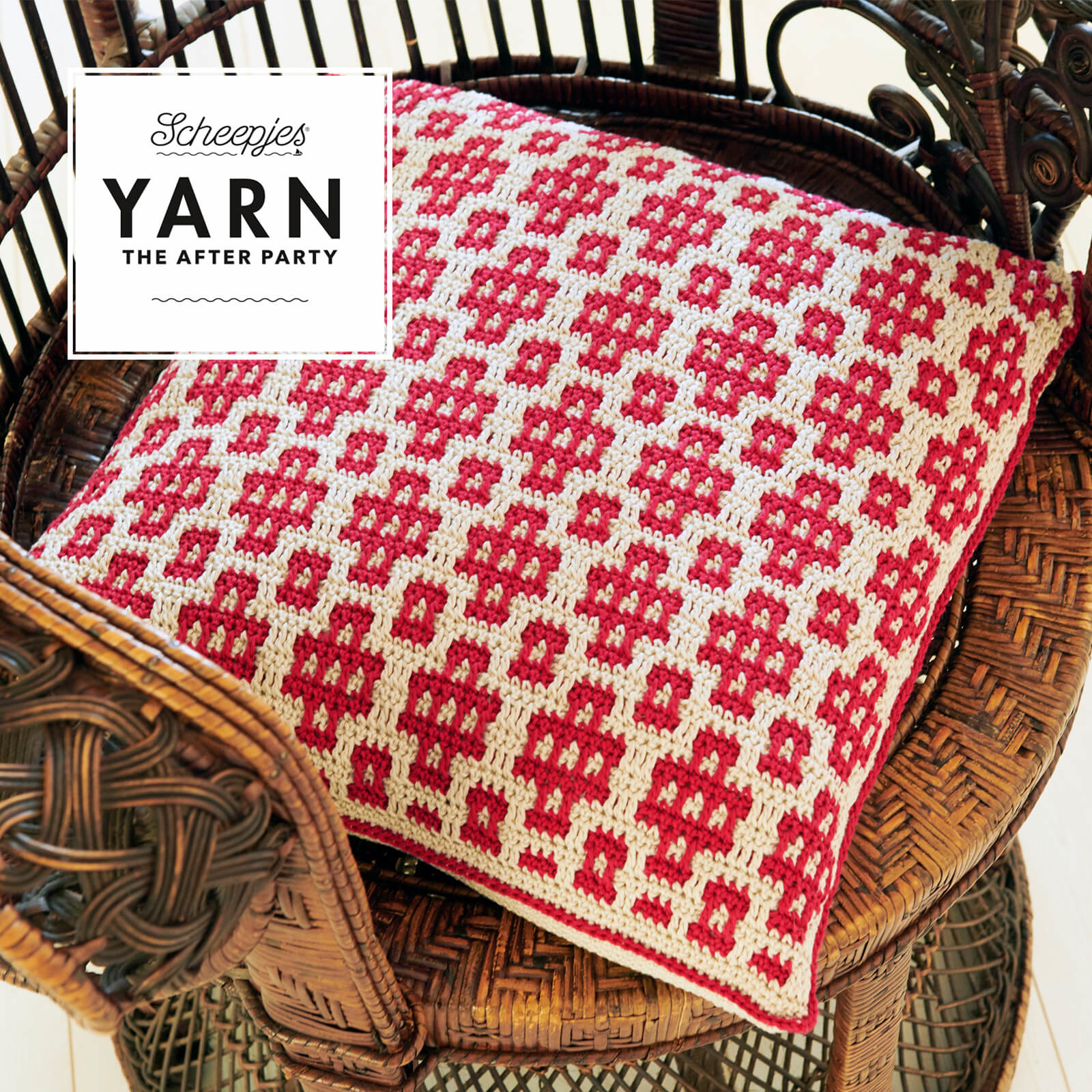 Het tweede patroon van Esme Crick: de Swifts Cushion. Wederom een tijdloos ontwerp met geometrische vormen. Het tweede kussen in deze serie is ook ontworpen met de mozaïek haaktechniek, waardoor de roodgekleurde motieven extra contrasteren met de champagnekleurige achtergrond.