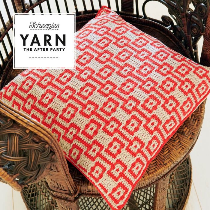 Net als de Busy Bees en de Swifts Cushion is dit ontwerp ook gemaakt met de mozaïek haaktechniek, waardoor de oranje motieven extra contrasteren met de champagnekleurige achtergrond.