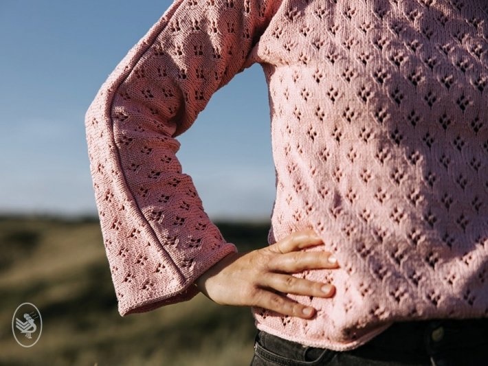 Aestas is het perfecte kledingstuk voor koelere zomeravonden. Het simpele romantische kantpatroon geeft het luchtige truitje een interessante textuur.