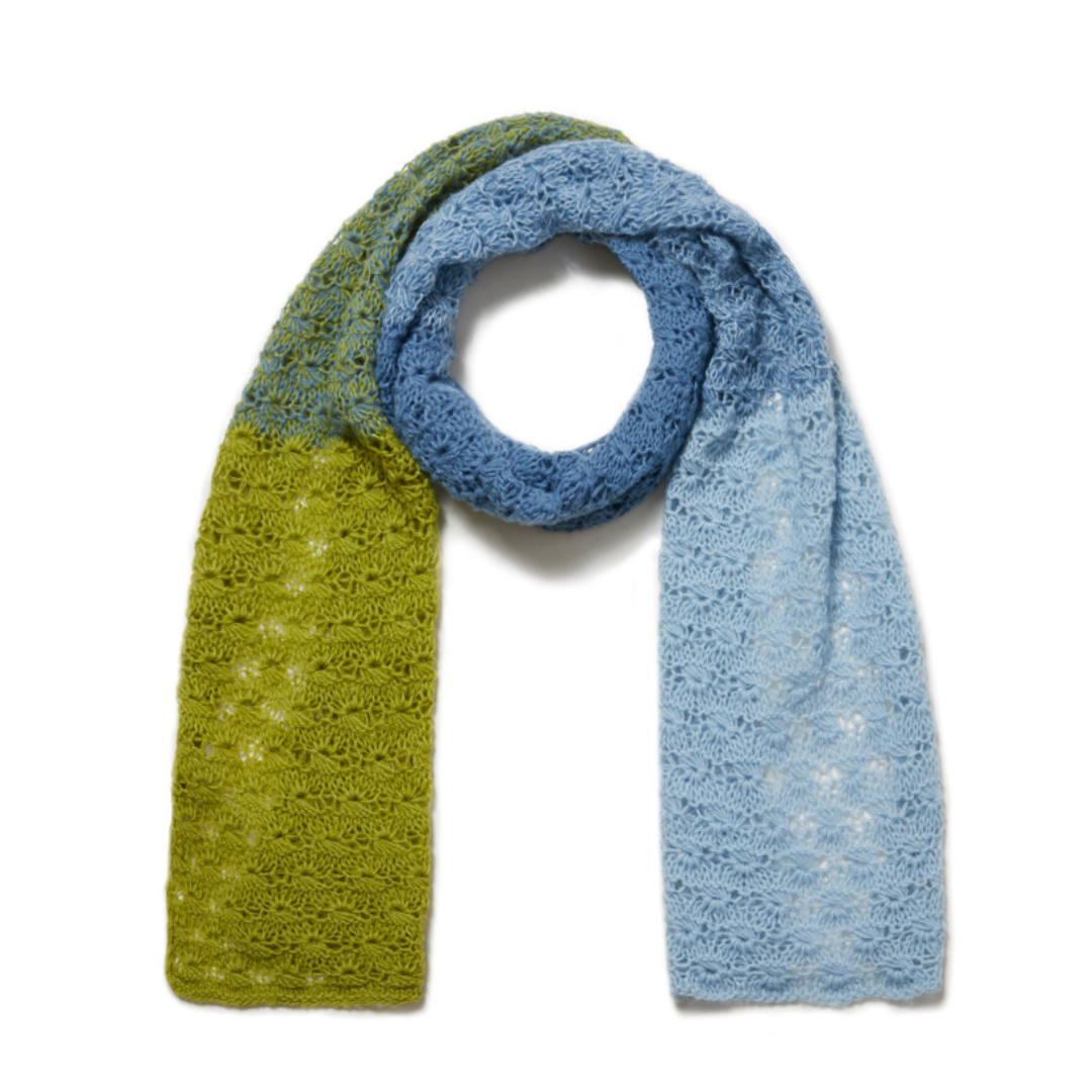 Een leuke sjaal gebreid met Lana Grossa Soffio. Een zacht draad van wol, katoen en kasjmier. Voor het voorbeeld zijn de volgende kleuren gebruikt: