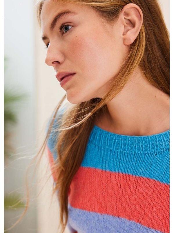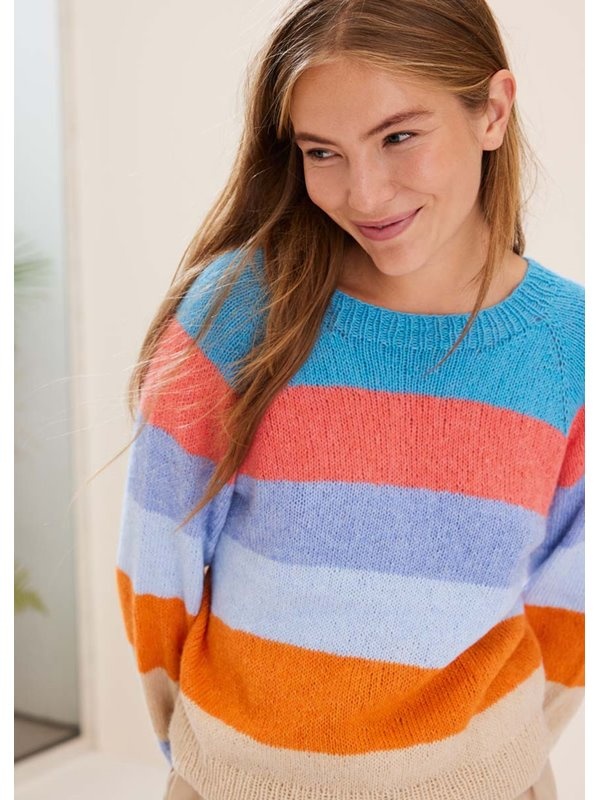 De trui met brede strepen wordt van boven naar beneden aan één stuk gebreid.
