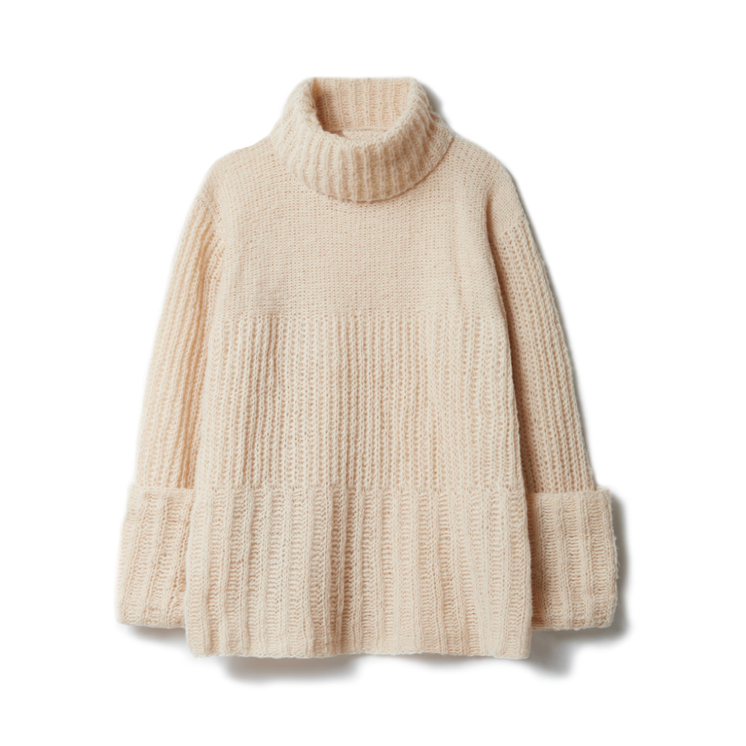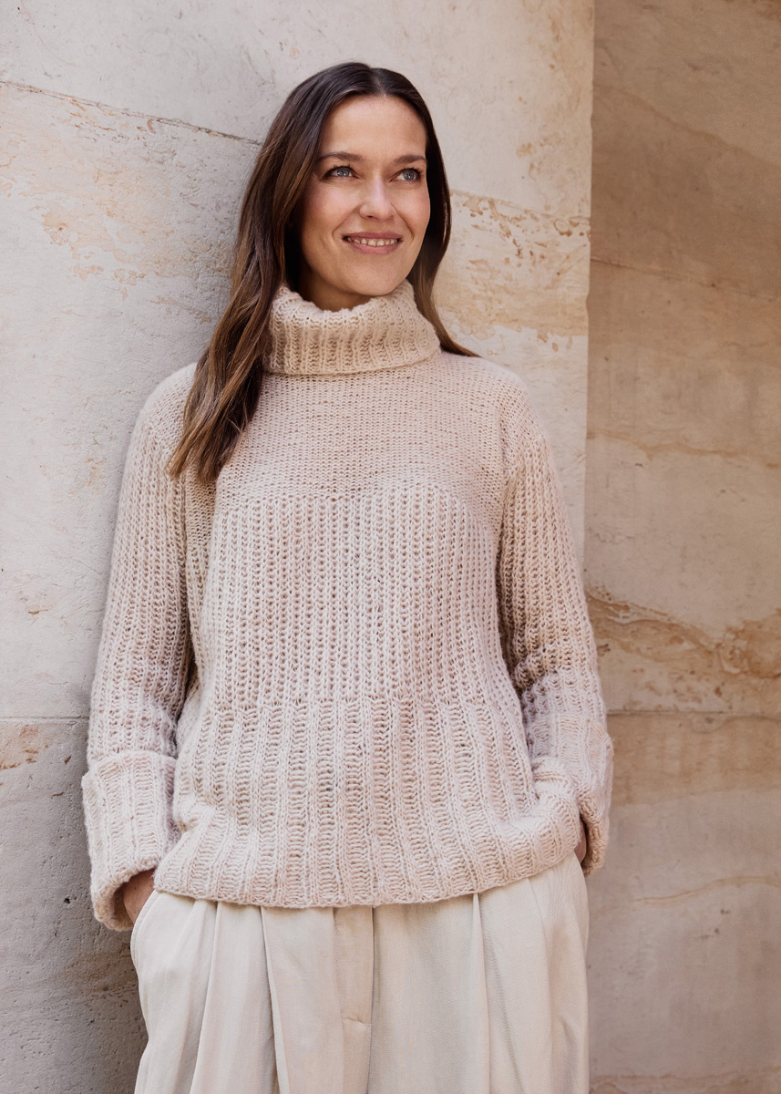 Een leuke en elegante trui gebreid met Lana Grossa Soffio. Een zacht draad van wol, katoen en kasjmier. Het voorbeeld is in de kleur 17 - lichtbeige gemaakt.