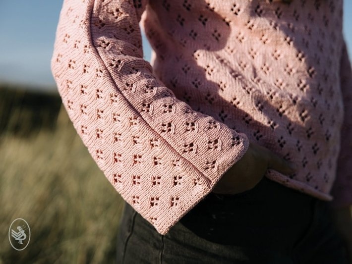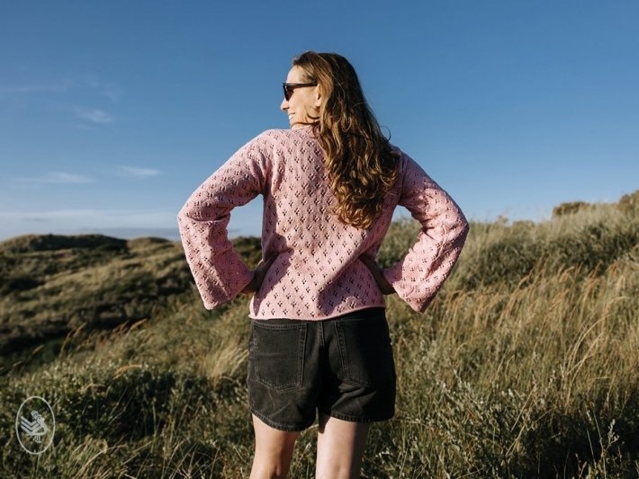 Aestas is het perfecte kledingstuk voor koelere zomeravonden. Het simpele romantische kantpatroon geeft het luchtige truitje een interessante textuur.