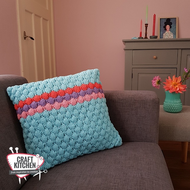 BeschrijvingBreipatroon: Colour Pop Bubble Kussen