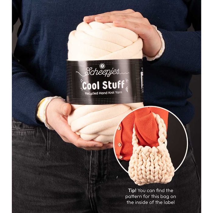 Scheepjes Cool Stuff is een jumbo garen gemaakt van 100% gerecycled polyester. Het bestaat uit een tunnel van tricotstof die gevuld is met zachte vezels. Geen aanbevolen naalddikte, geschikt voor handbreien