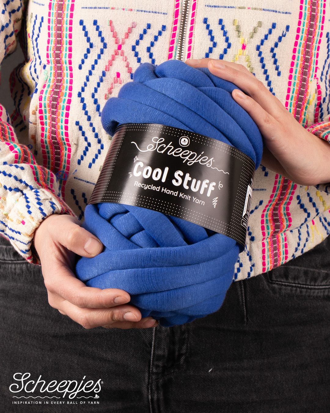 Scheepjes Cool Stuff is een jumbo garen gemaakt van 100% gerecycled polyester. Het bestaat uit een tunnel van tricotstof die gevuld is met zachte vezels. Geen aanbevolen naalddikte, geschikt voor handbreien