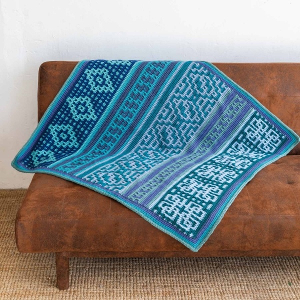 Deze prachtige deken wordt gehaakt met Merino Aran van Katia en is verkrijgbaar in 4 verschillende kleurstellingen, Earth, Water en Air.