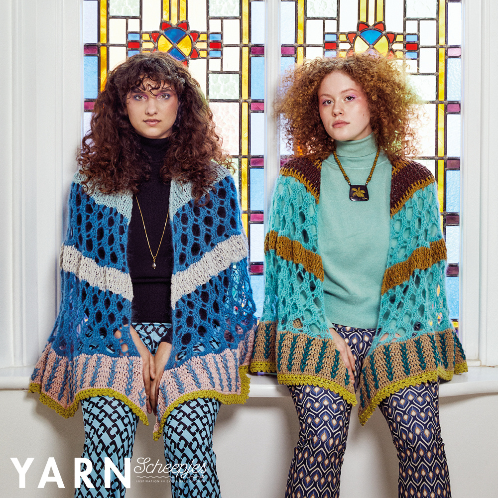 Verwen jezelf met deze prachtige, halvemaanvormige kanten sjaal. Gehaakt in een mohairmix garen gecombineerd met een felted tweed verzel, valt het elegant over je schouders en omhult het je in fijne warmte. Een betoverende accessoire.