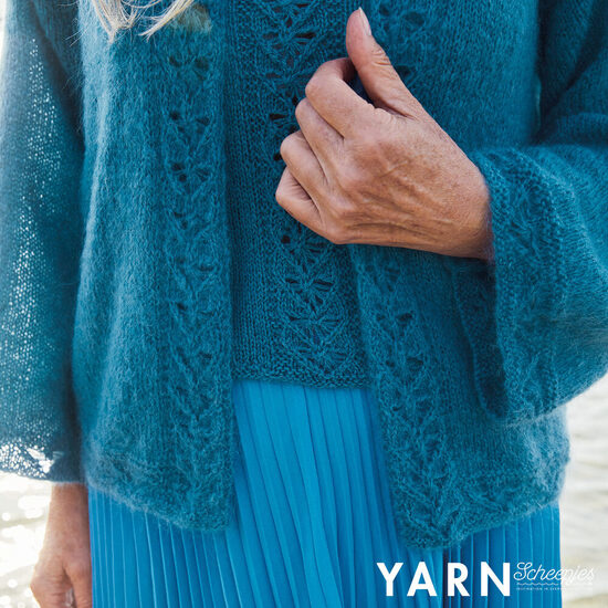 Een twinset in mix-en-match zustergaren is een must voor je garderobe. Vernuftig gebreid kantwerk geeft een moderne uitstraling en door het luxueuze, warme Alpaca en Mohair garen is het tijdens meerdere seizoenen te dragen. Hoe maak jij de top: kort of liever lang?