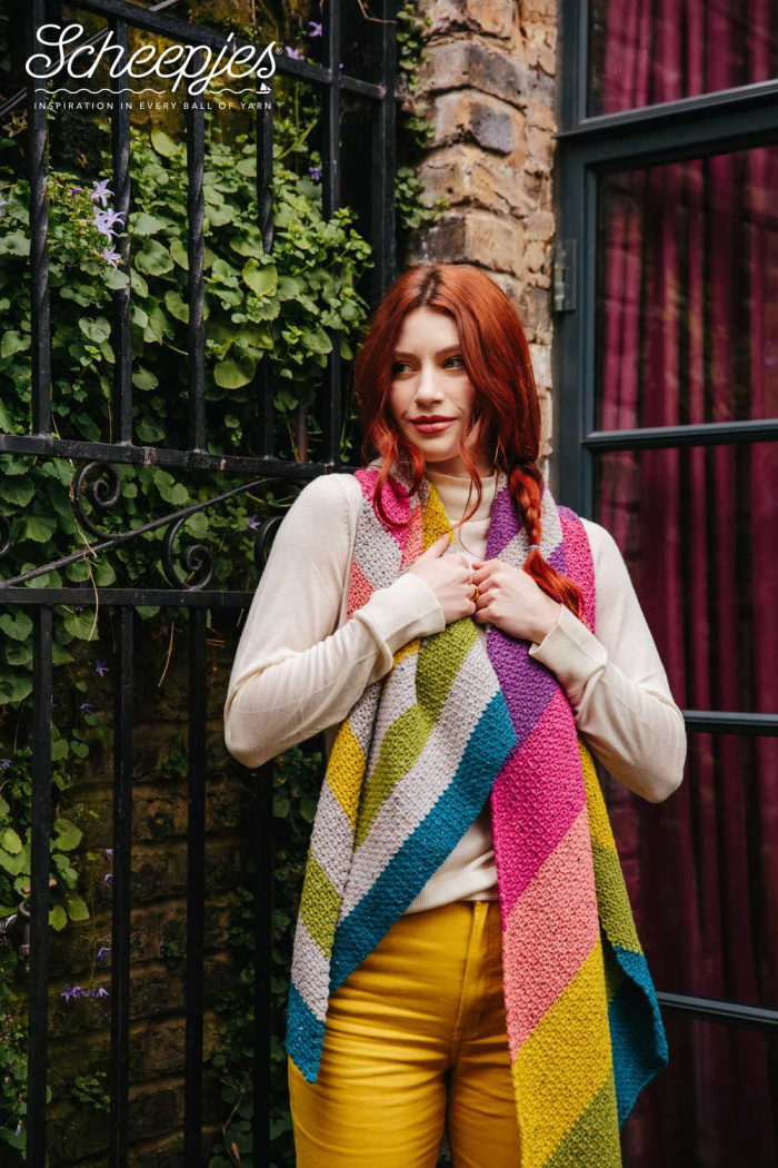 Deze prachtige sjaal wordt gehaakt met 8 bollen Scheepjes Terrazo. De sjaal heeft schuine kanten, waardoor het kleurverloop des te mooier uit komt.