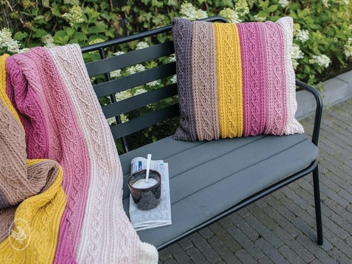 Prachtige deken met gekleurde stroken gehaakt in een origineel kabelmotief. De prachtige Cosy Fine kleuren zorgen voor een fris uiterlijk. Er is ook een bijpassend kussen bij deze deken, dit pakket kunt u hier vinden.