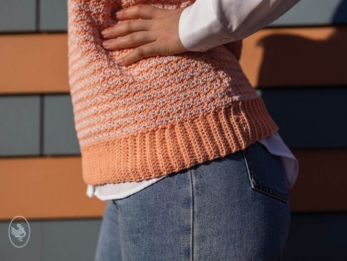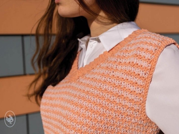 Het voorbeeld op de foto is gemaakt met kleur A (inclusief boord): 211 Peach & Kleur B:203 Light Pink. Het patroon is beschreven in maat S t/m XL.