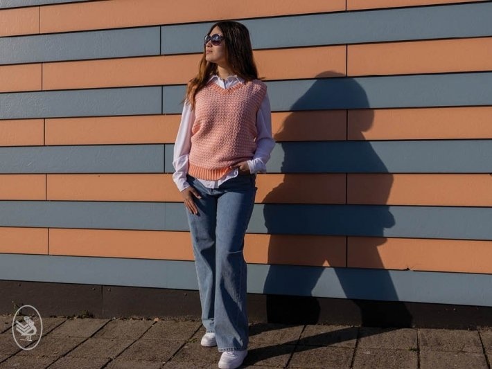 Haak deze trendy spencer en combineer met een witte blouse en je favoriete jeans voor een actuele look.