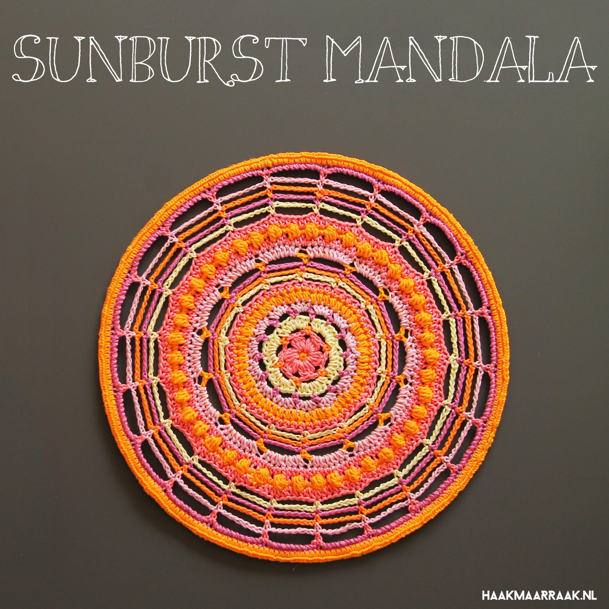 Deze mandala heet Sunburst Mandala en is ontstaan uit Simy's Year of Mandalas. Het ontwerp is van Haakmaarraak.
