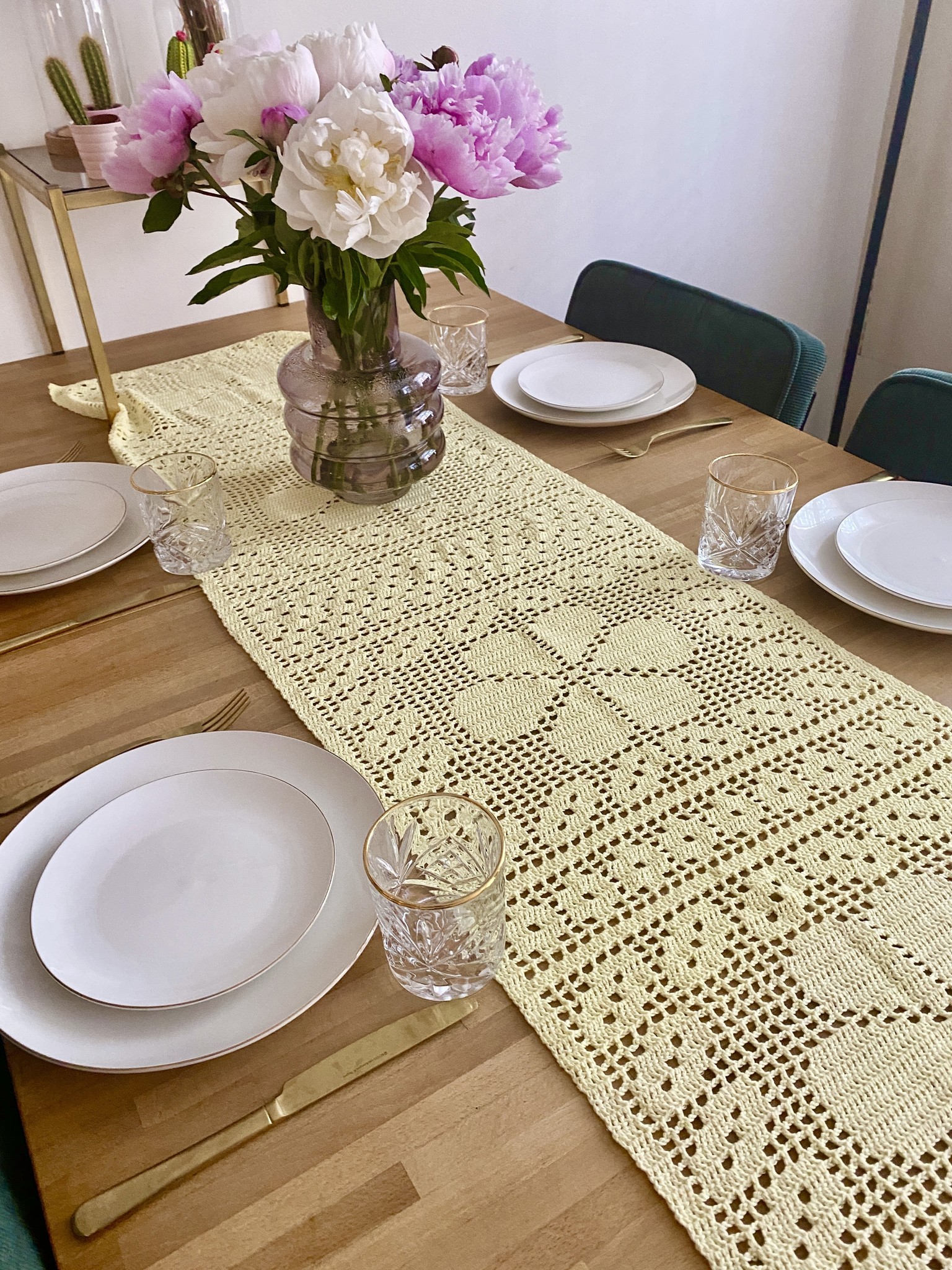 Haakpatroon voor een fleurige tafelloper gehaakt met de Filet Techniek. Gehaakt met Scheepjes Cotton 8, dit geeft keuze uit vele mooie kleurtjes!