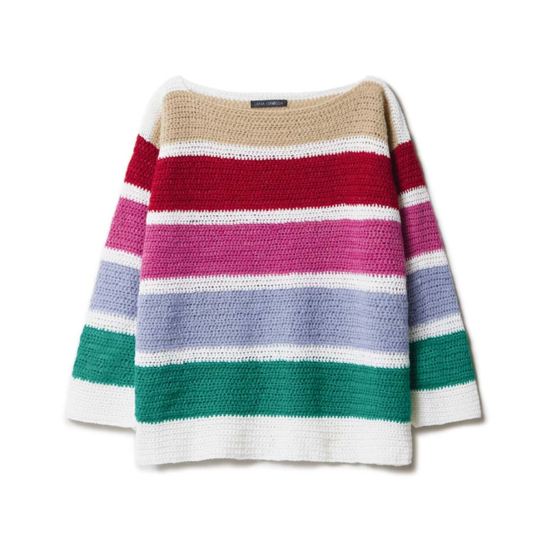 Haakpakket voor een leuke en kleurrijke trui gehaakt met Lana Grossa Ecopuno en Soffio. Het patroon komt uit het boek Häkeln 7.