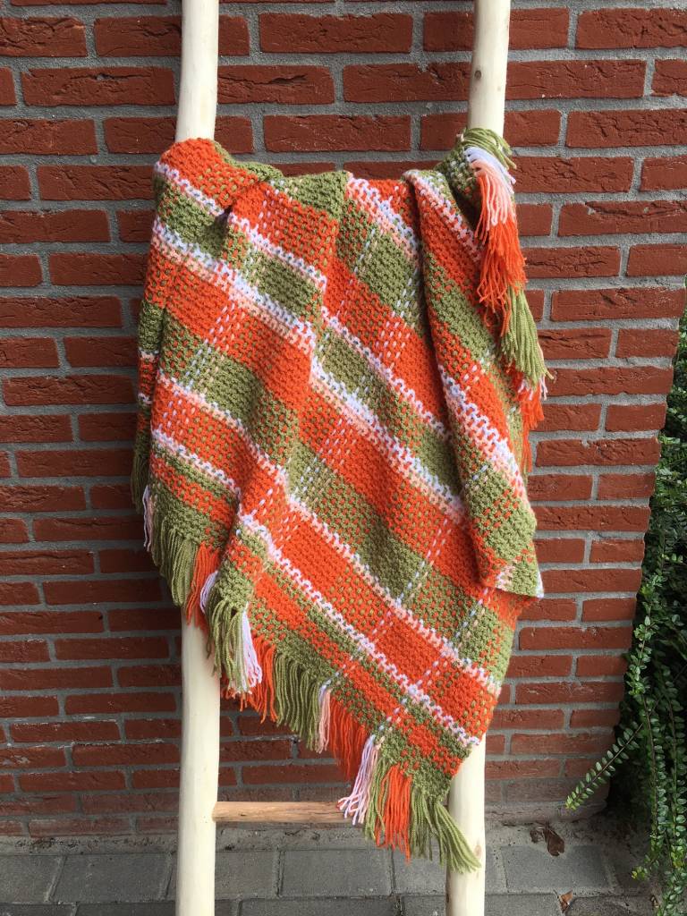 Deze leuke deken is een ontwerp van PB Knit and Design. De deken bestaat uit eenvoudige haaksteken, waarna de draad er doorheen geweven wordt.