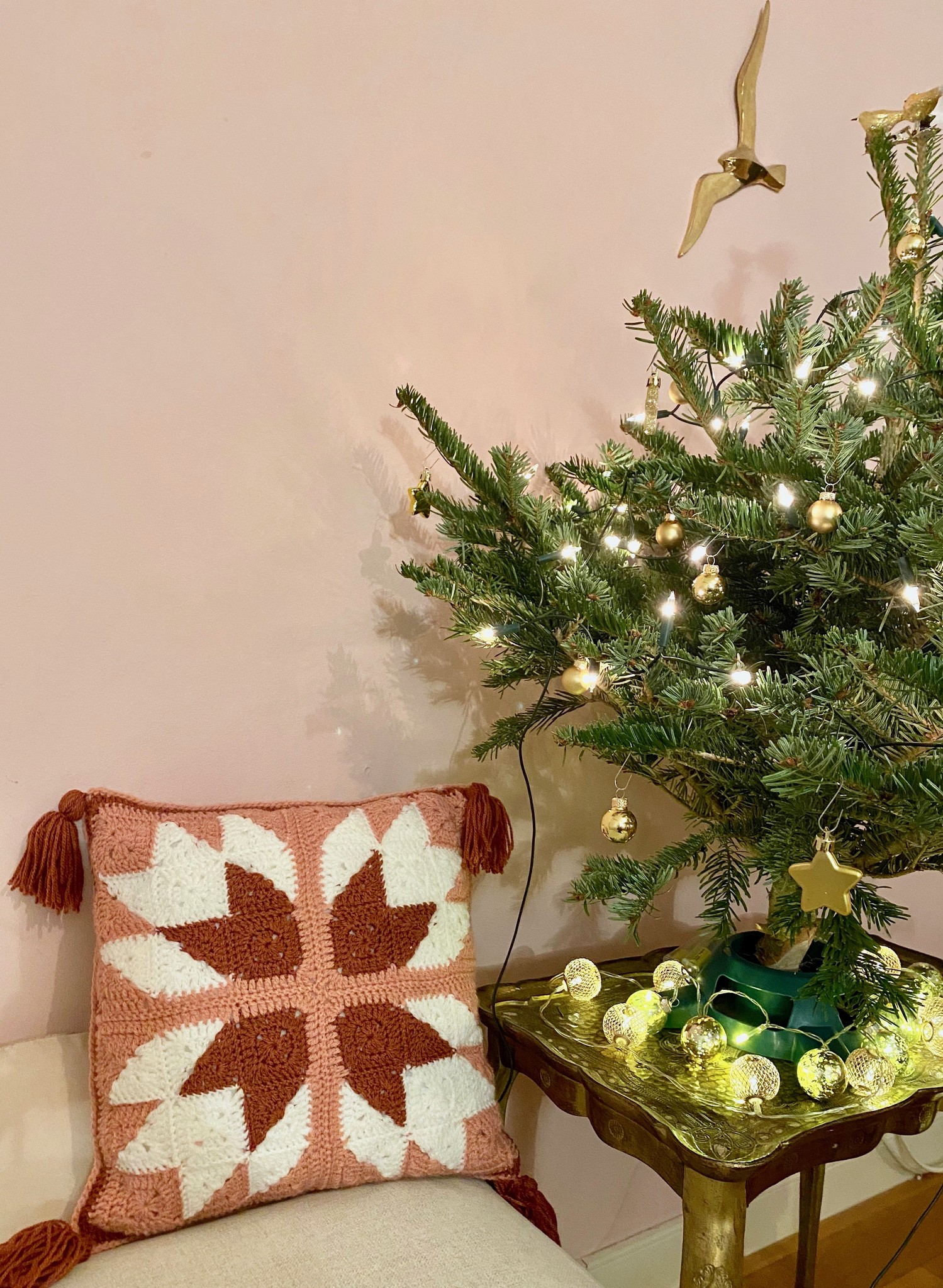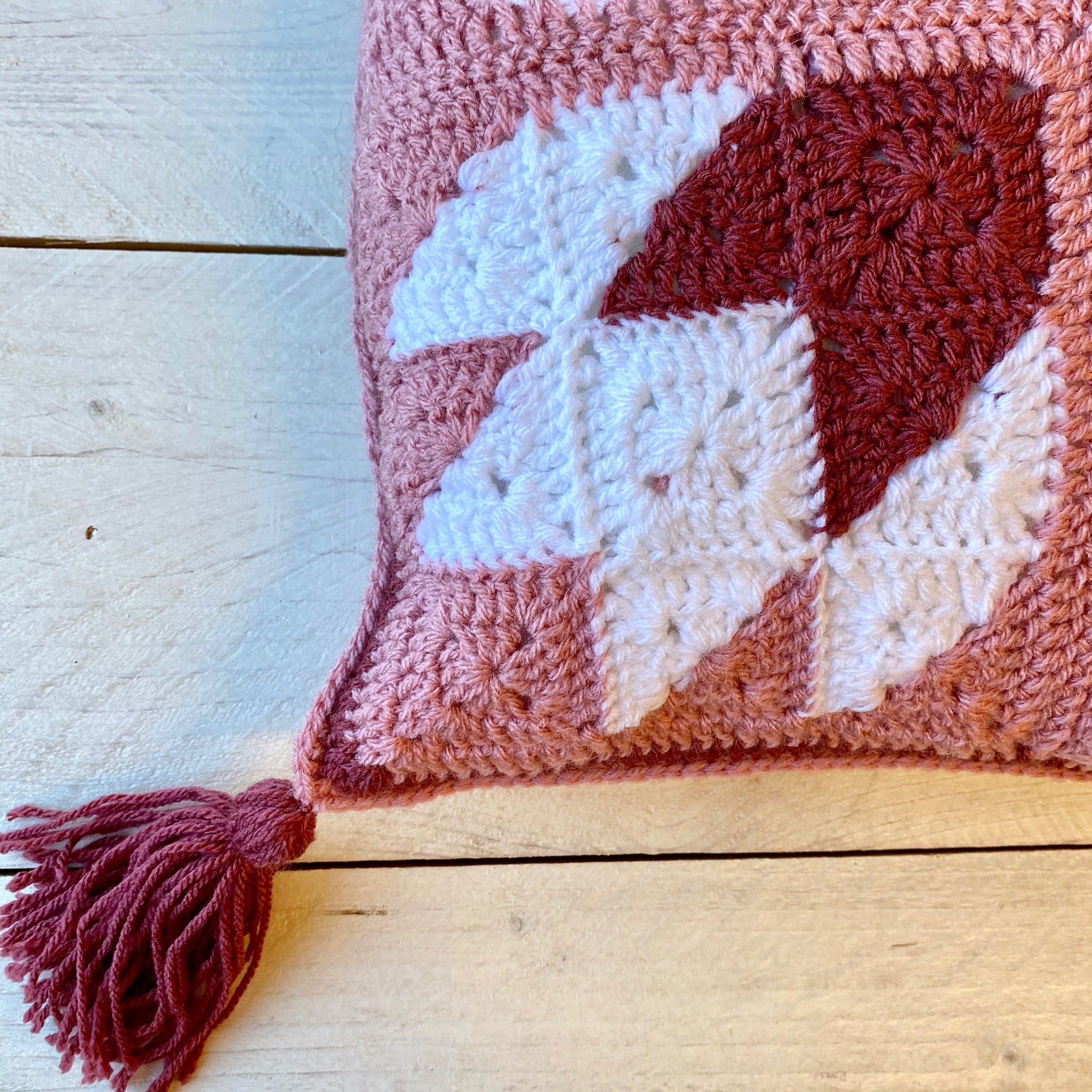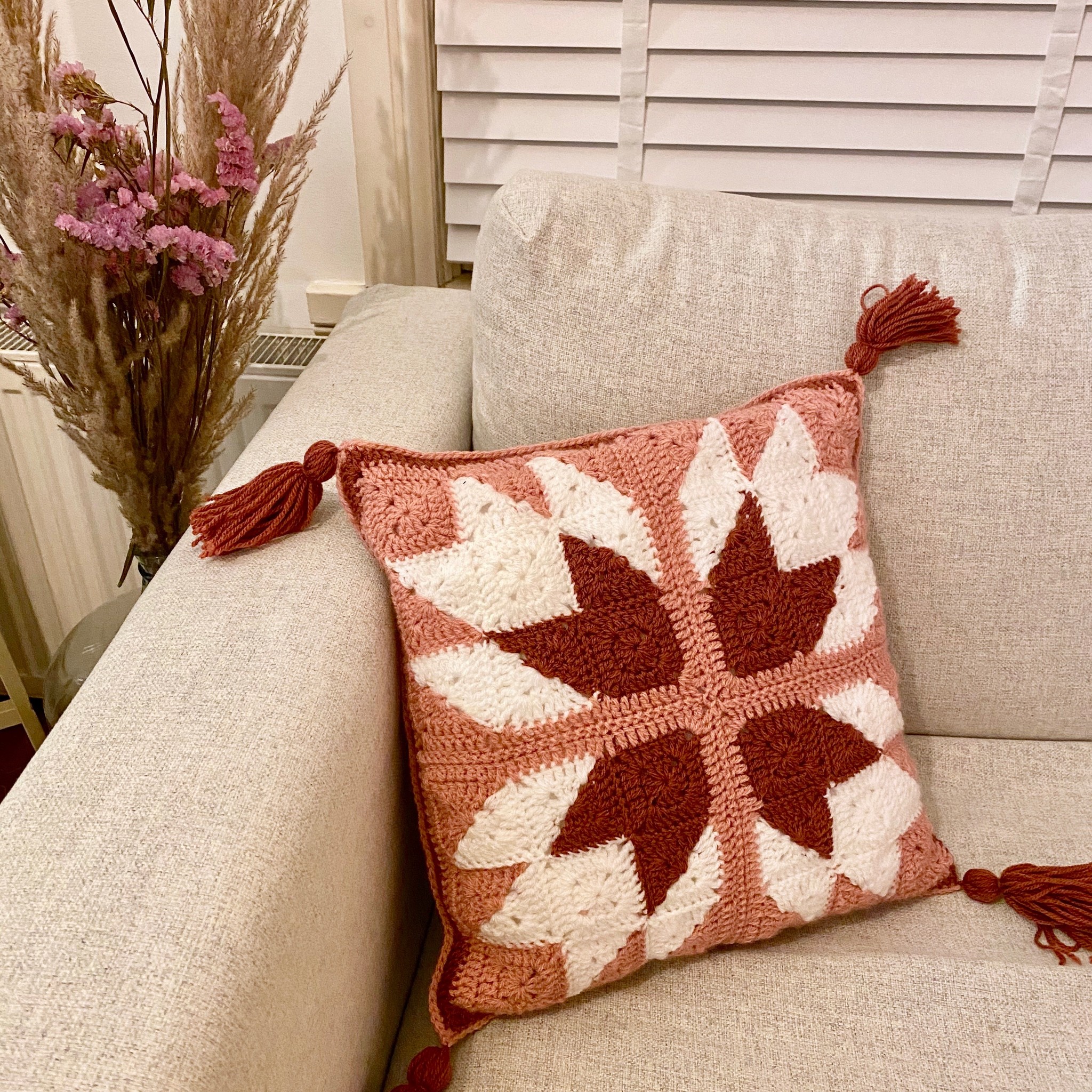 Haakpakket voor een prachtig kussen met een ijsster. Dit gezellige kussen is samengesteld uit de verschillende vierkantjes die aan elkaar gemaakt worden.