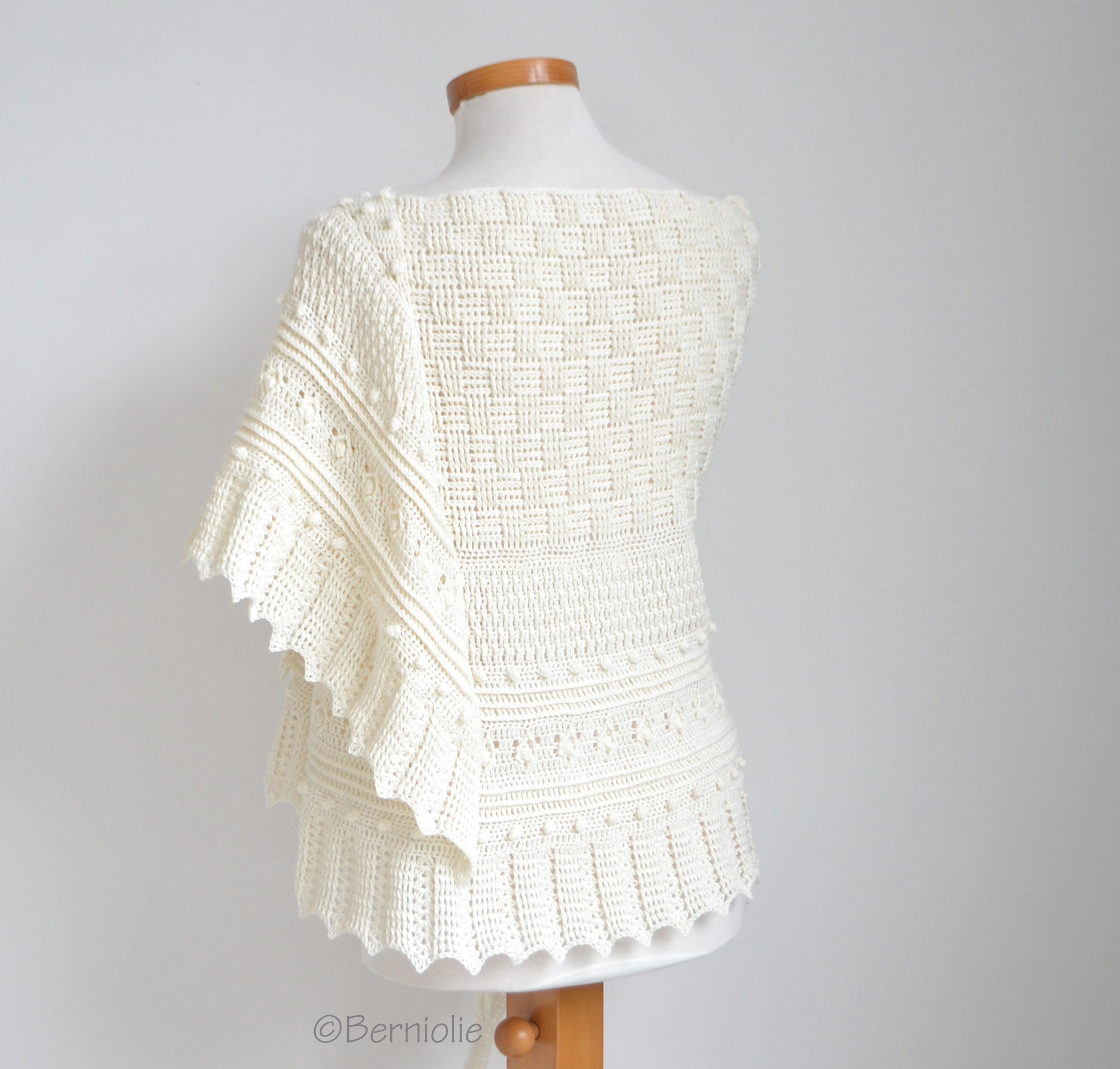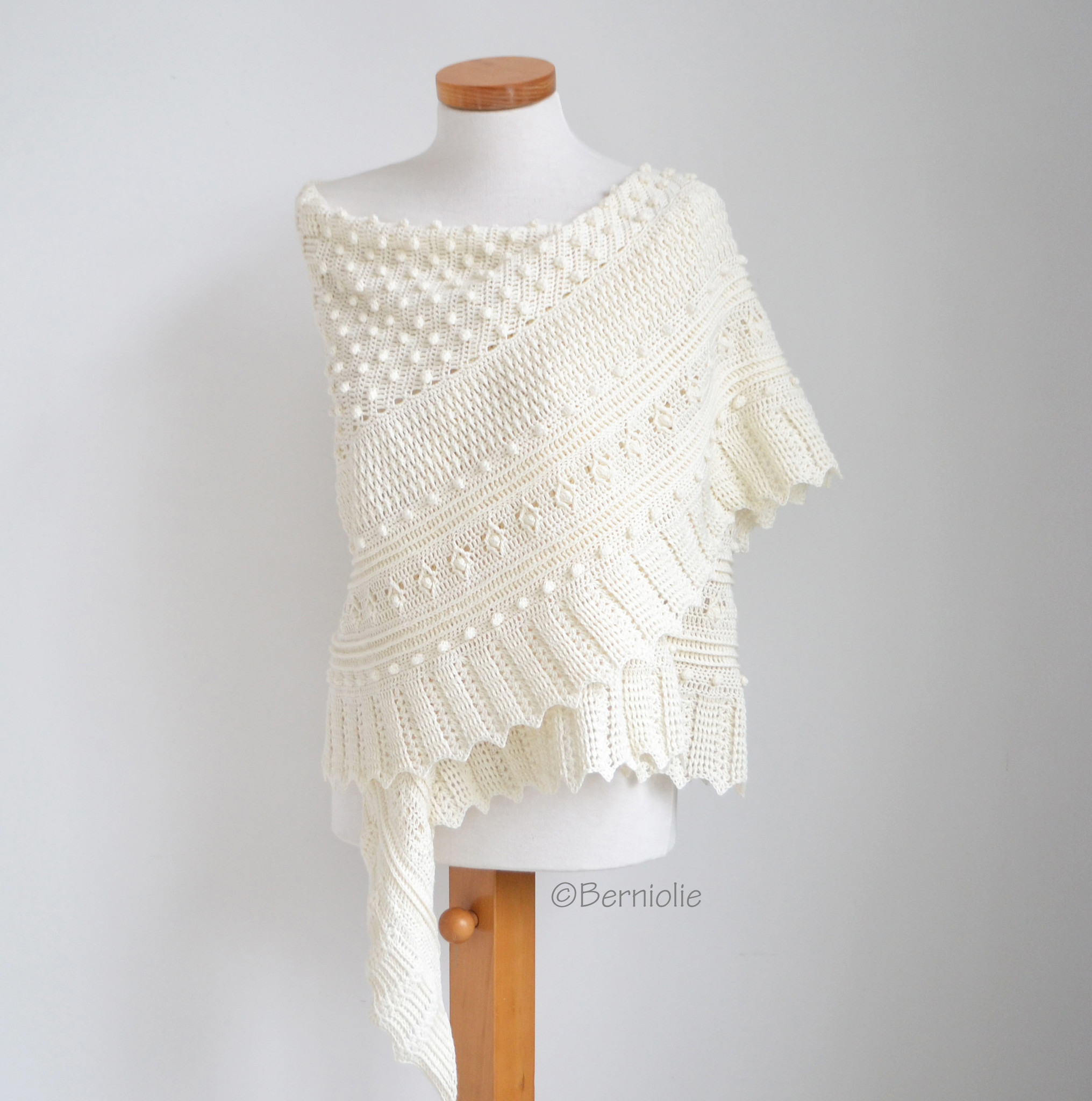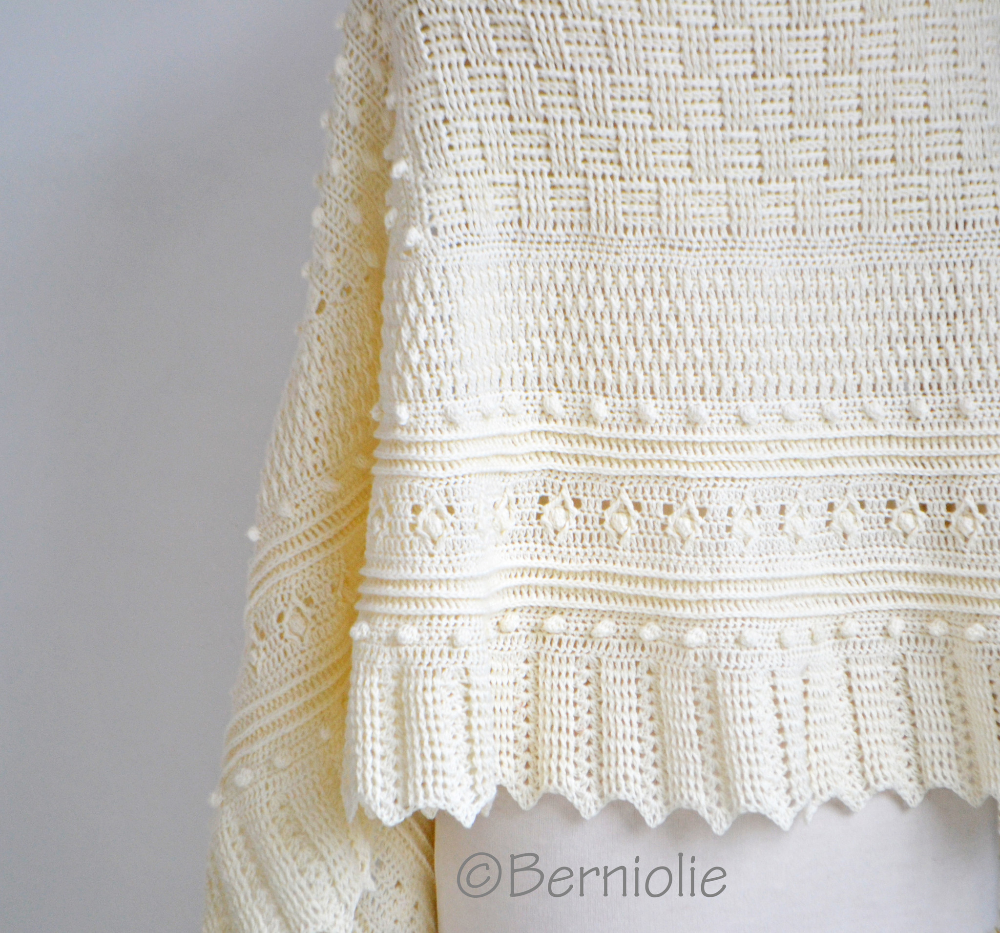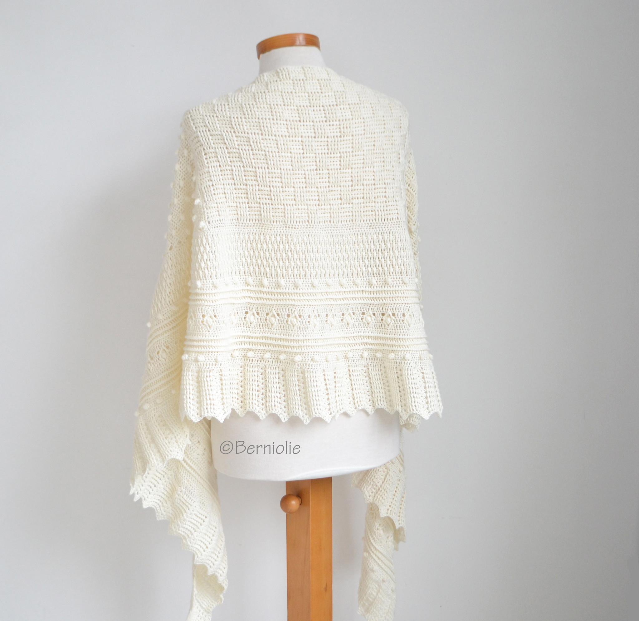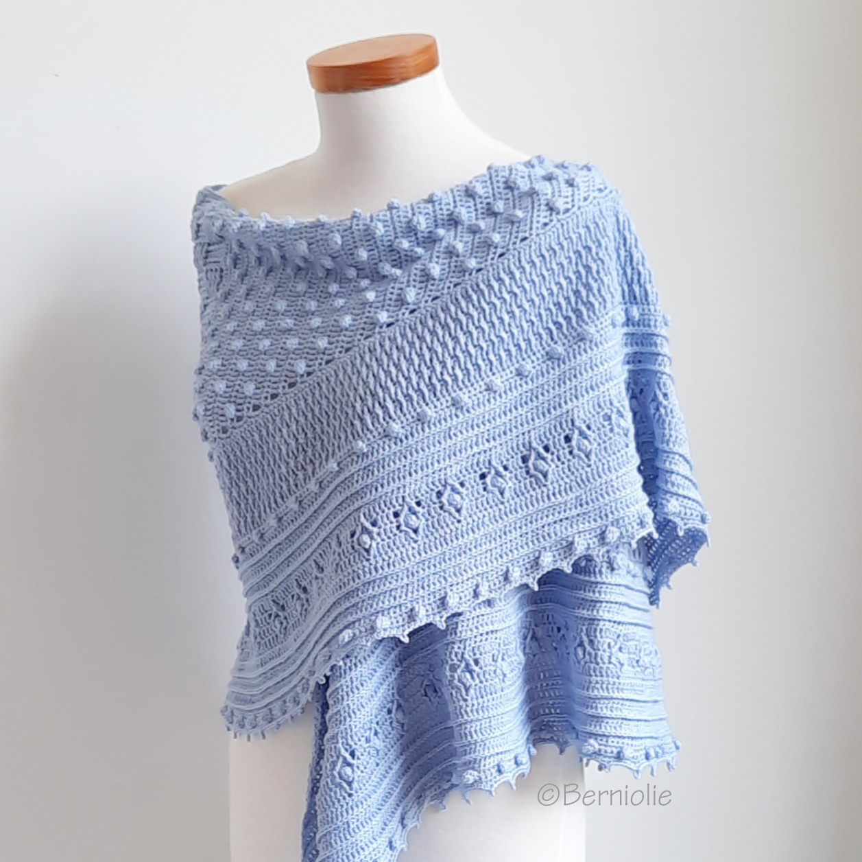 Het digitale patroon voor een mooie omslagdoek in de vorm van een verlengde halve cirkel en met leuke reliëf steken.