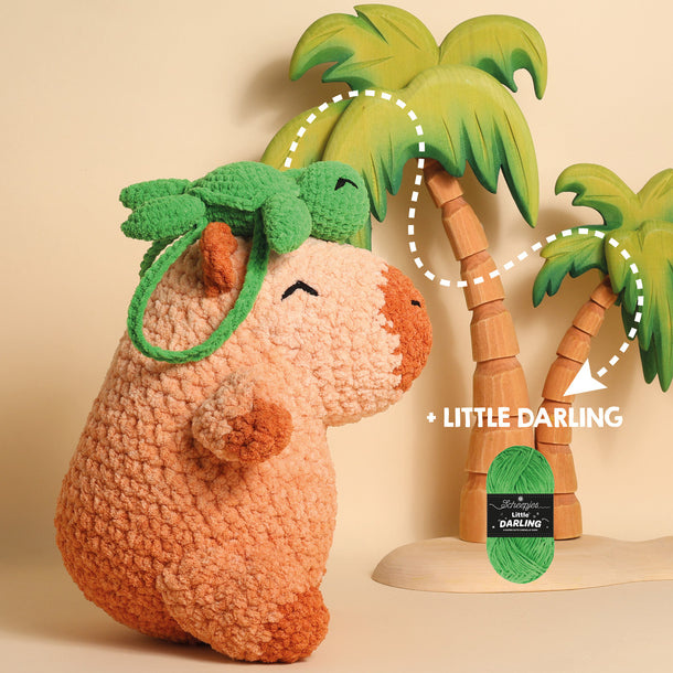 Het haakpatroon is los verkrijgbaar of als compleet garenpakket. Met het patroon haak je zowel de capybara als de bijpassende accessoires. Kies je voor het pakket, dan maak je één capybara met een Cake-garen naar keuze (op de foto: Pony en Red Panda), en voeg je eenvoudig één accessoire toe met een bol Little Darling in jouw favoriete kleur.