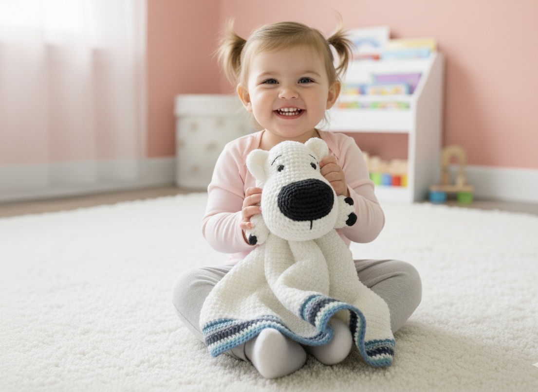 Het patroon voor de geweldige Little Darling deken met een ijsbeer.