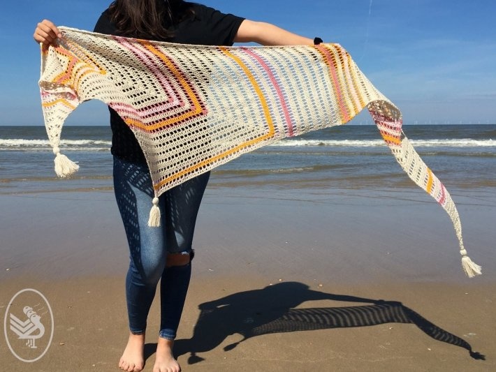 Een grote shawl met kite vorm die door de eenvoudige steken ook uitermate geschikt is voor beginnende hakers. Ook ervaren hakers zullen veel plezier aan dit haakpatroon beleven, dankzij de vrolijke gekleurde strepen!