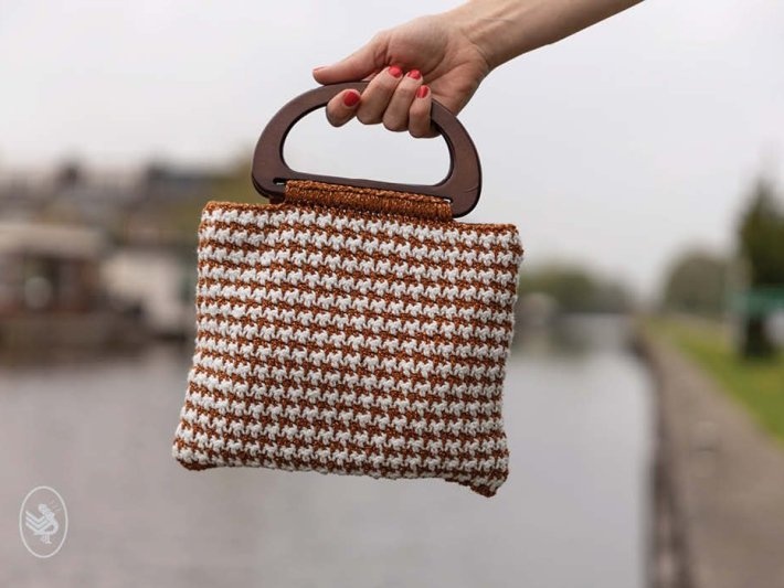 Dit handtasje in een klassiek pied-de-poule dessin is superleuk en eenvoudig om te haken. Het tasje is groot genoeg voor bijvoorbeeld je telefoon, je make-up spulletjes en je sleutels.