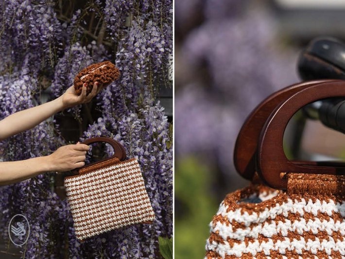 Dit handtasje in een klassiek pied-de-poule dessin is superleuk en eenvoudig om te haken. Het tasje is groot genoeg voor bijvoorbeeld je telefoon, je make-up spulletjes en je sleutels. De mooie bruine houten handvaten maken het geheel af. Met het glam garen en een mooie rosé kleurige portemonnee sluiting maak je in een handomdraai dit leuke beursje dat perfect bij het tasje past.