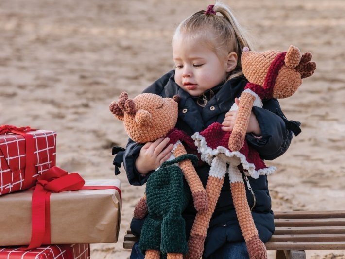 Deze lieve knuffel hertjes Rudy & Noëlle zijn gemaakt met het zachte Durable Velvet. De hertjes zijn helemaal in kerstsfeer met het bordeaux rode rokje en het groene pakje. Met het makkelijke patroon en haaknaald 4 mm is de knuffel snel klaar! Wie geef jij een knuffel met Kerst?