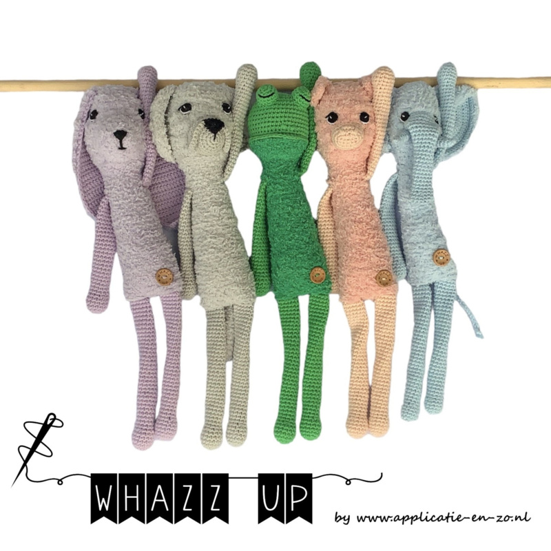 De beestjes worden gehaakt met Scheepjes Softfun, waarbij het lijf en het hoofd in de achterste lus gehaakt worden. Daarna haak je softy in de voorste lussen, waardoor je alles teken goed kunt zien.