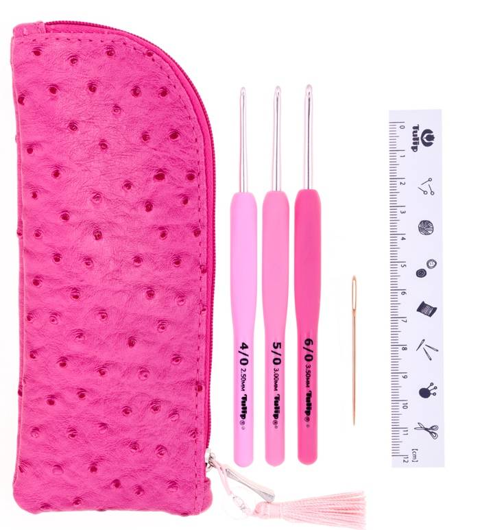 De haaknaalden zitten in een prachtig etuitje, afgewerkt met een leuk flosje.