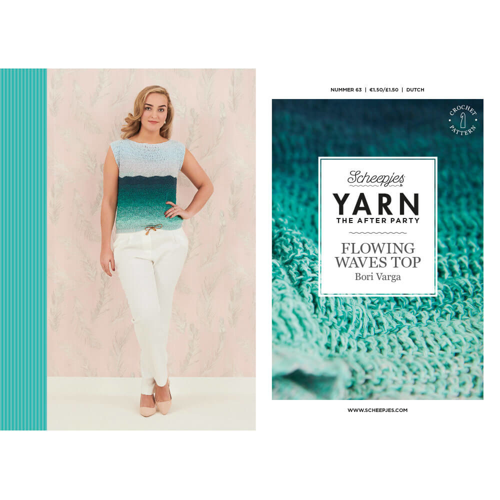 Met trots presenteren wij editie 63 van de Scheepjes YARN The After Party serie: de Flowing Waves Top, ontworpen door Bori Varga. Breid de garderobe uit met dit eigentijdse haakontwerp dat bij elke outfit als blikvanger zal dienen! De top heeft een charmante open rug en wordt in één stuk in rijen heen en weer gehaakt. Het patroon beschrijft de maten S t/m XXL en bevat naast uitgeschreven instructies ook een schema en stekendiagram.